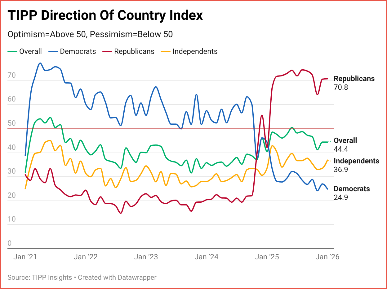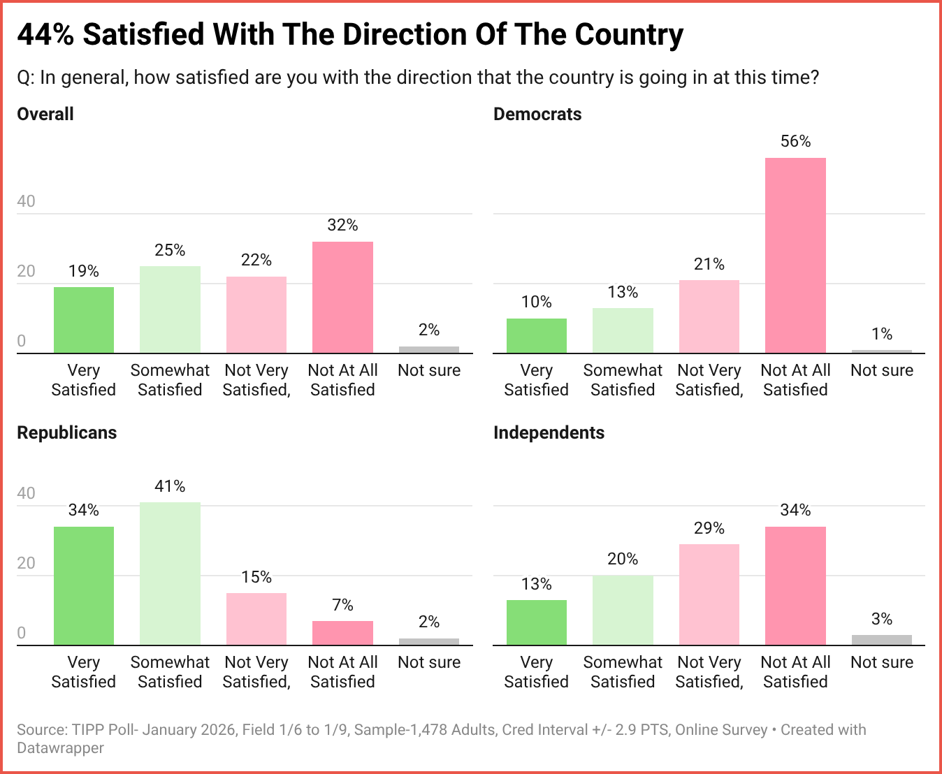 Each month, the TIPP Poll probes the general sentiment about the country’s direction using the survey question, "In general, how satisfied are you with the direction that the country is going in at this time?"