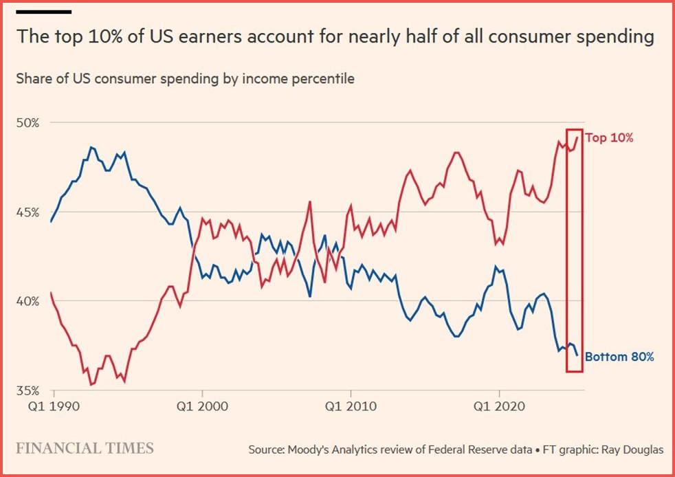 The highest-earning 10 percent of Americans now account for a record 49 percent of all consumer spending, up 13 points over the past three decades. At the same time, the bottom 80 percent’s share has fallen to about 37 percent, highlighting how economic growth and consumption have become increasingly concentrated among higher-income households.