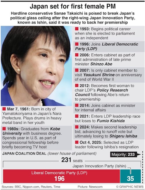 Sanae Takaichi is on track to become Japan's first female prime minister, after the right-wing Japan Innovation Party, known as Ishin, said it was ready to back her premiership.