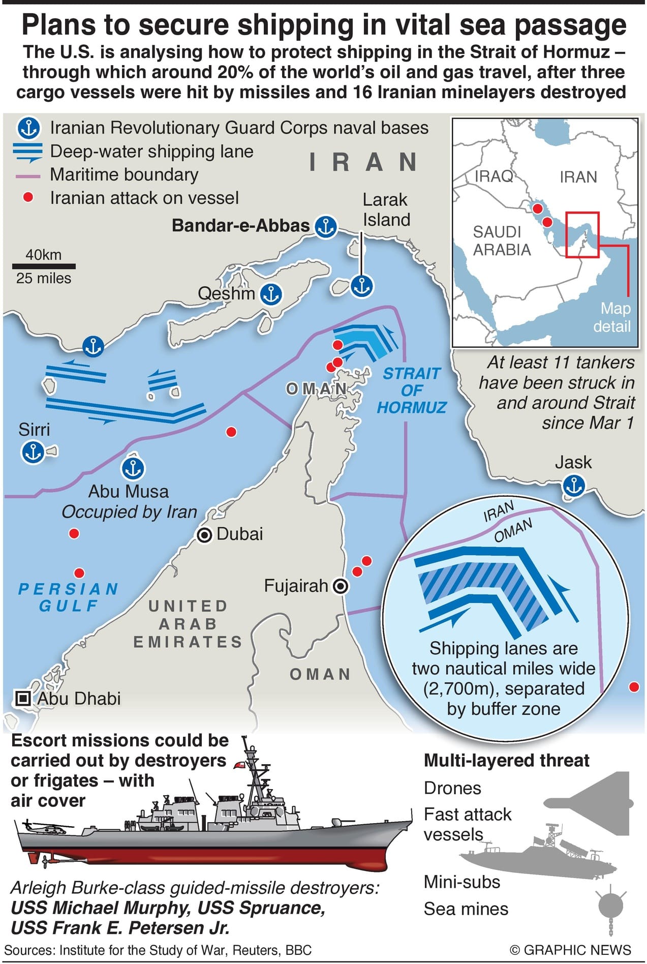 The U.S. is analyzing how to protect shipping in the Strait of Hormuz, through which around 20% of the world’s oil and gas travel, after three cargo vessels were hit by missiles and 16 Iranian minelayers were destroyed.