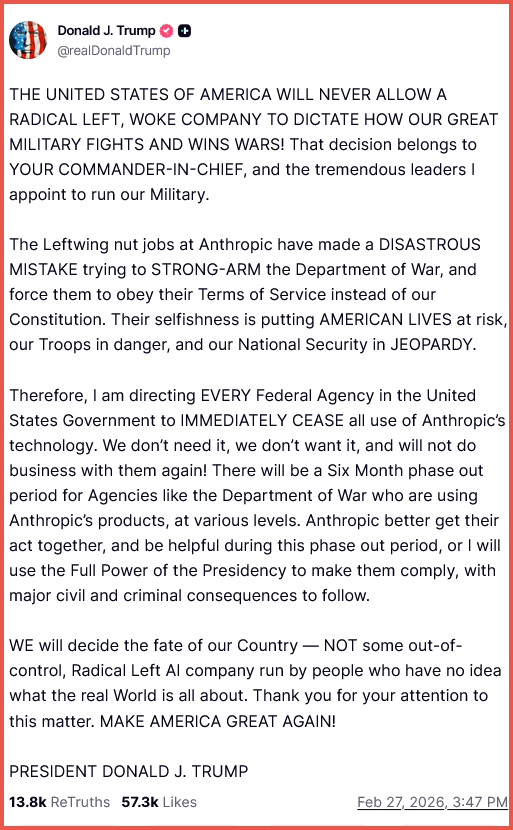 I. Trump Orders Federal Agencies To Stop Using Anthropic AI