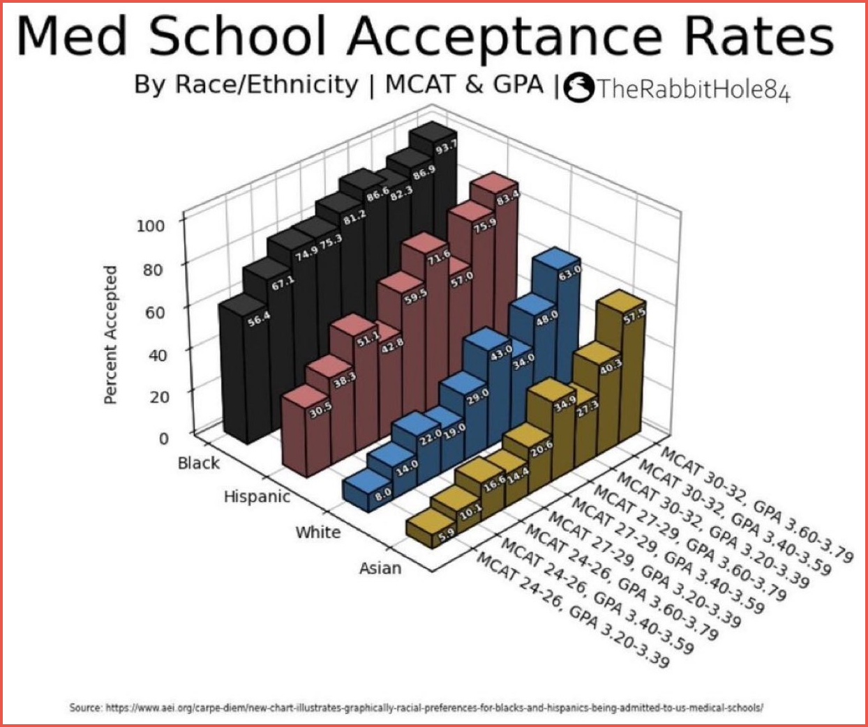 Chart shows acceptance rates by race and ethnicity across MCAT score and GPA ranges.