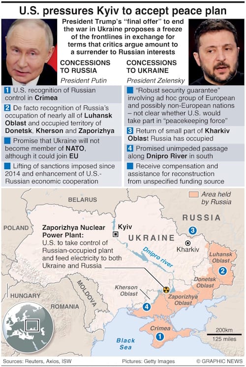 President Trump’s “final offer” to end the war in Ukraine proposes a freeze of the frontlines in exchange for terms that critics argue amount to a surrender to Russian interests.