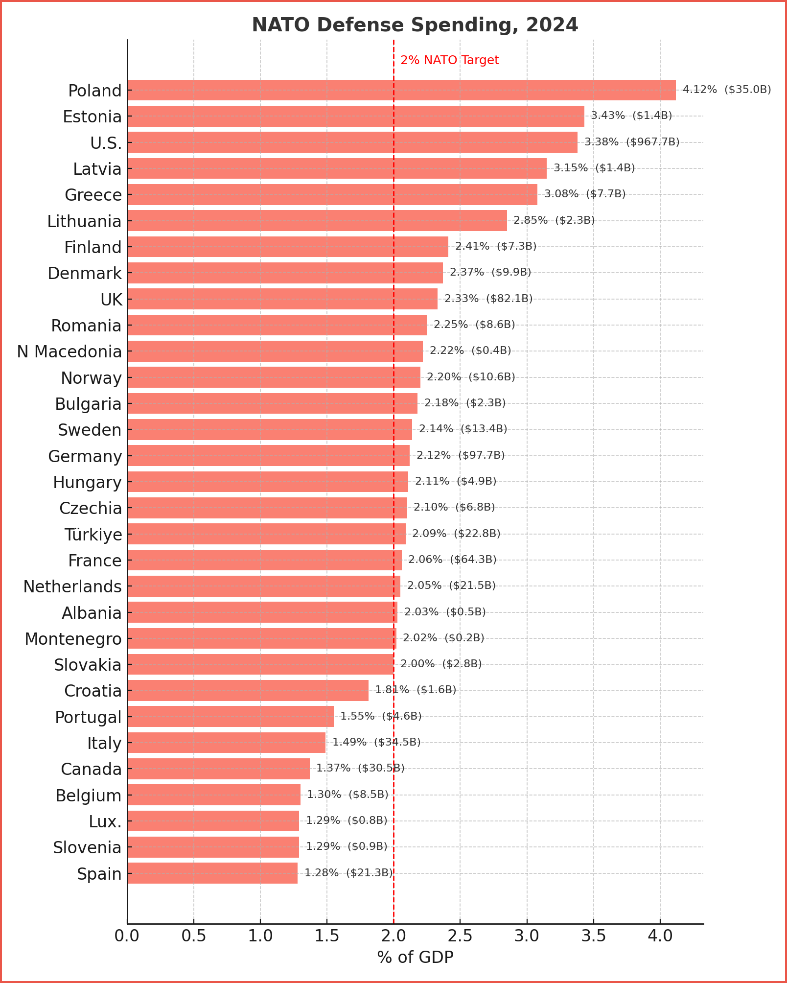 By 2024, twenty-three NATO members had finally met the alliance’s 2 percent of GDP defense spending target. Poland leads at over 4 percent. The United States contributes about 3.4 percent, still the largest in absolute terms at nearly a trillion dollars. Germany, once mocked for spending barely 1.25 percent, has been forced to raise its outlays after years of underinvestment and reliance on Russian energy. The burden is shifting, but Washington remains the indispensable paymaster.