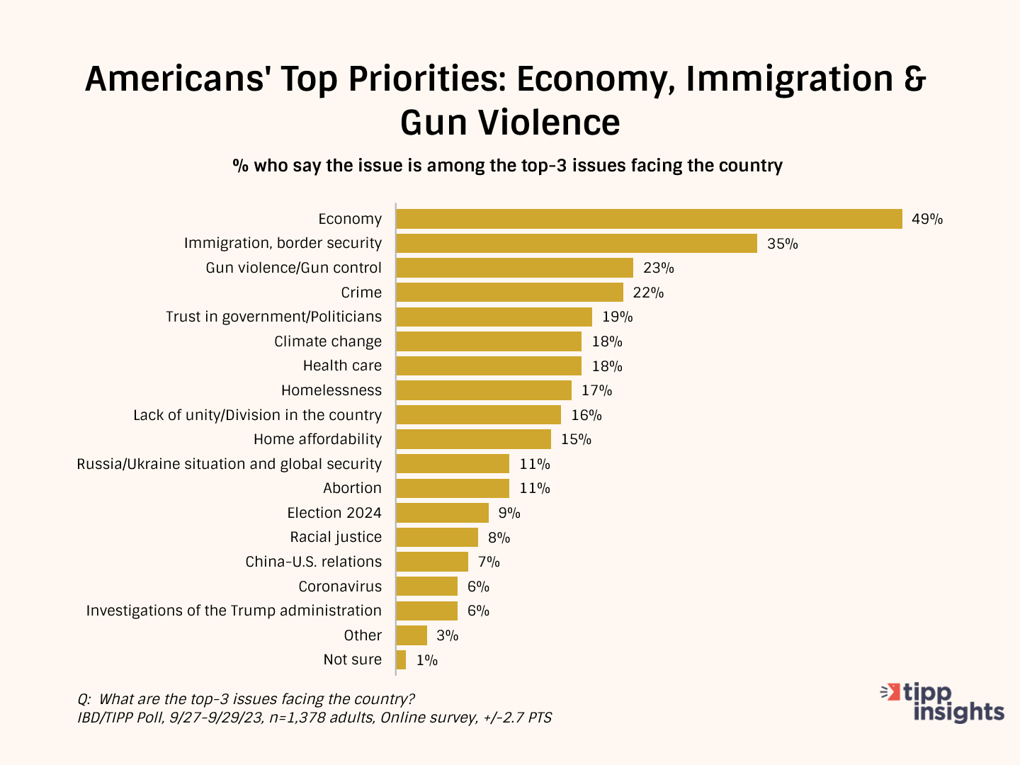 Forty-nine percent of Americans picked the economy as the country's most important issue, followed by immigration/border security at 35 percent and gun violence/gun control at 23 percent as the other top concerns.