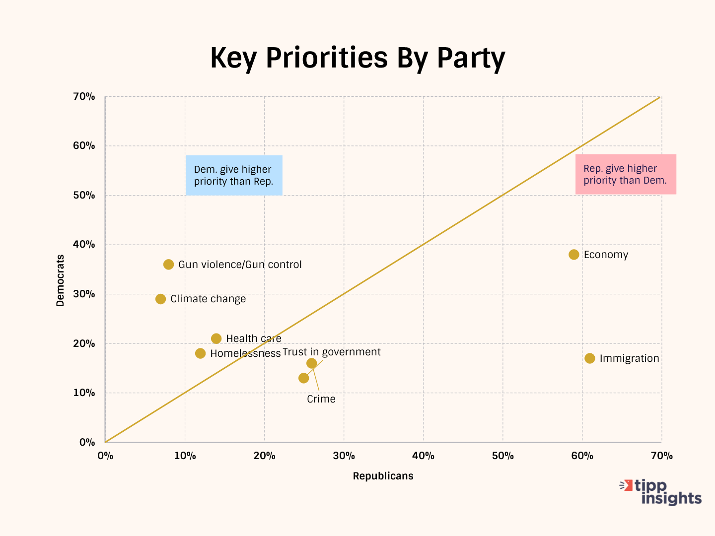 Independents aligned more closely with Republicans, with their top issues being the economy (51%), immigration/border security (30%), crime (25%), gun violence/gun control (23%), trust in government/politicians (22%), and health care (20%).