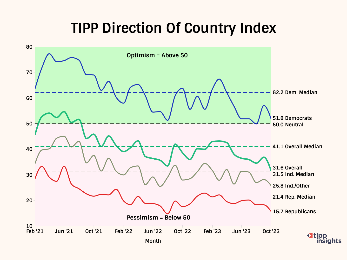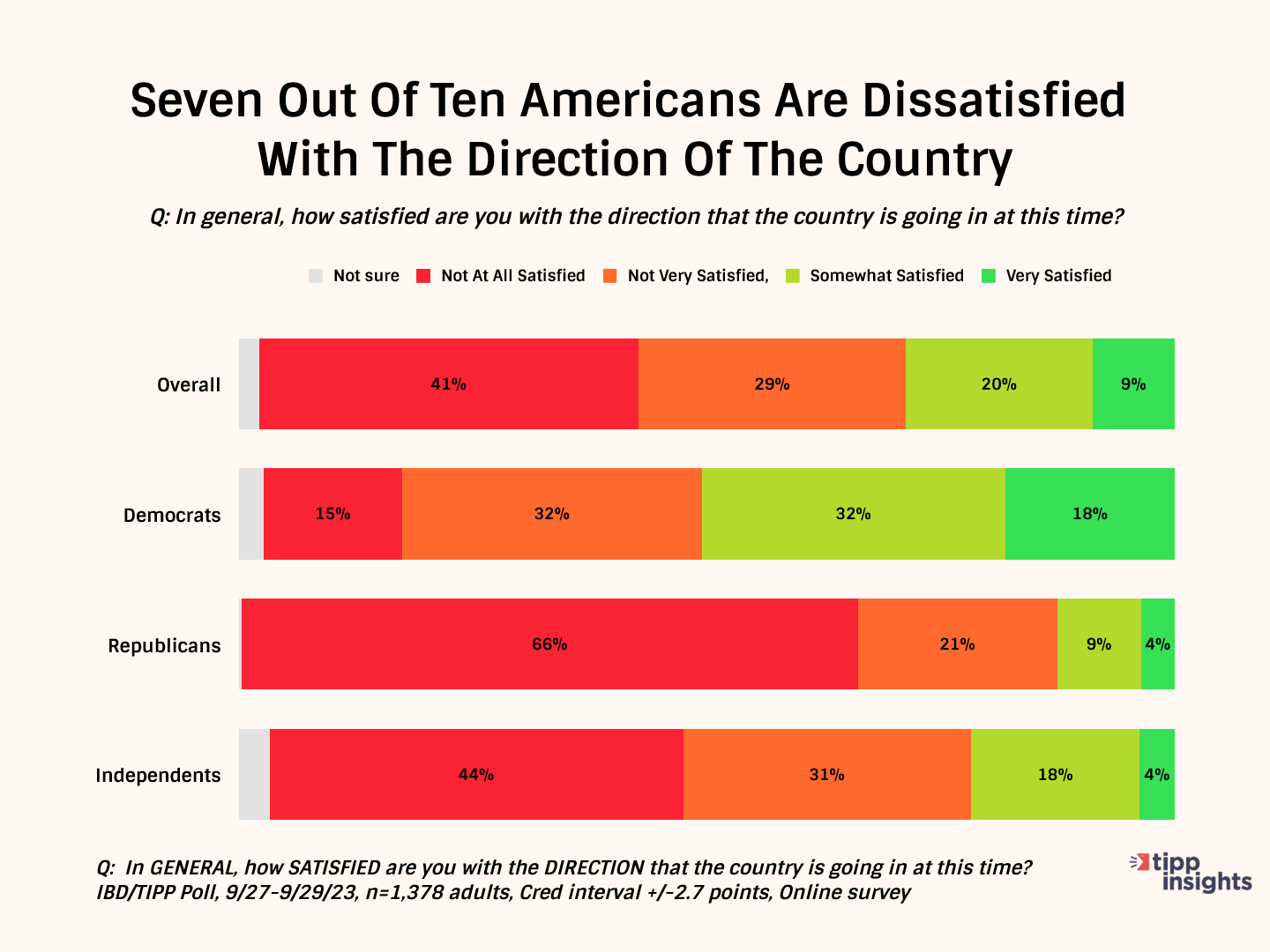 Each month, IBD/TIPP Poll probes the general sentiment about the country’s direction using the survey question, "In general, how satisfied are you with the direction that the country is going in at this time?"