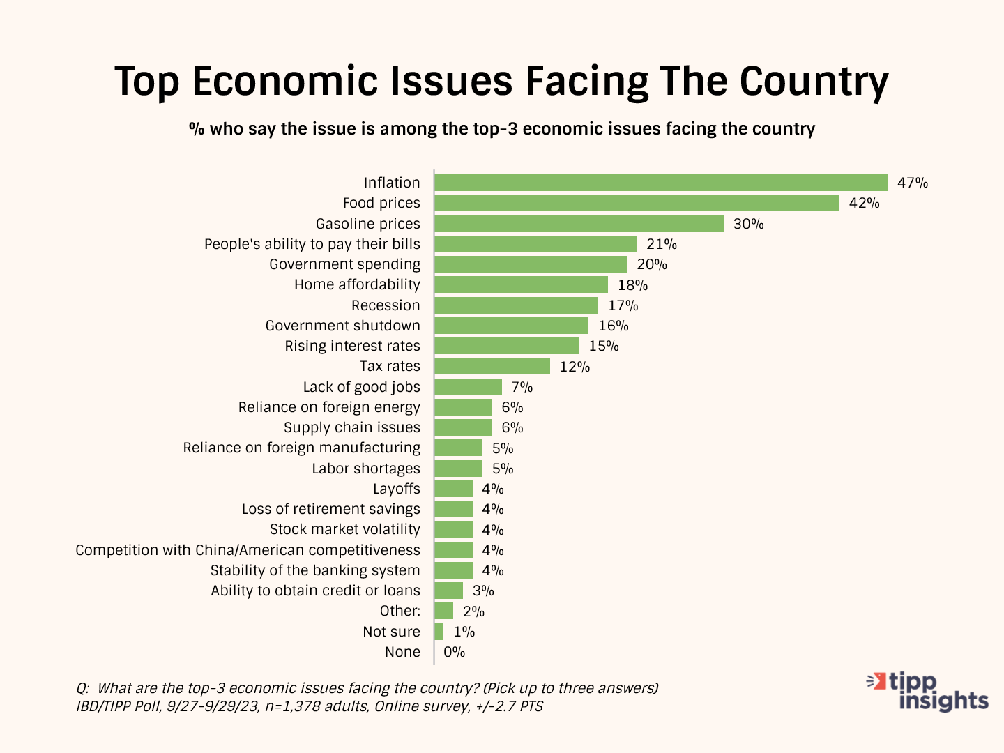 Inflation (47%), food prices (42%), and gasoline prices (30%) are the top three economic issues facing Americans.
