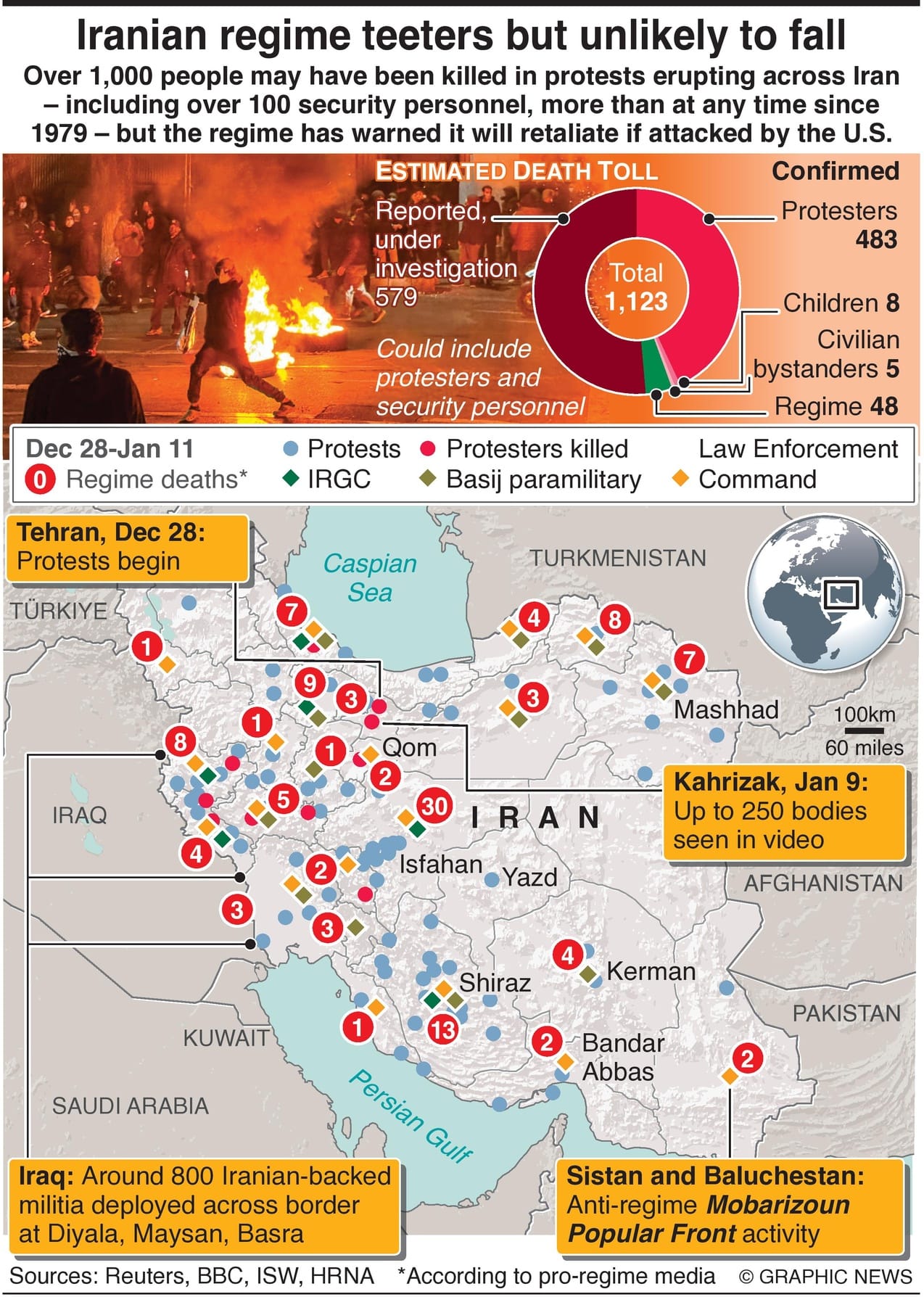 Over 1,000 people have been killed in the protests erupting across Iran including over 100 security personnel, more than at any time since 1979 – but the regime has warned it will retaliate if attacked by the U.S.