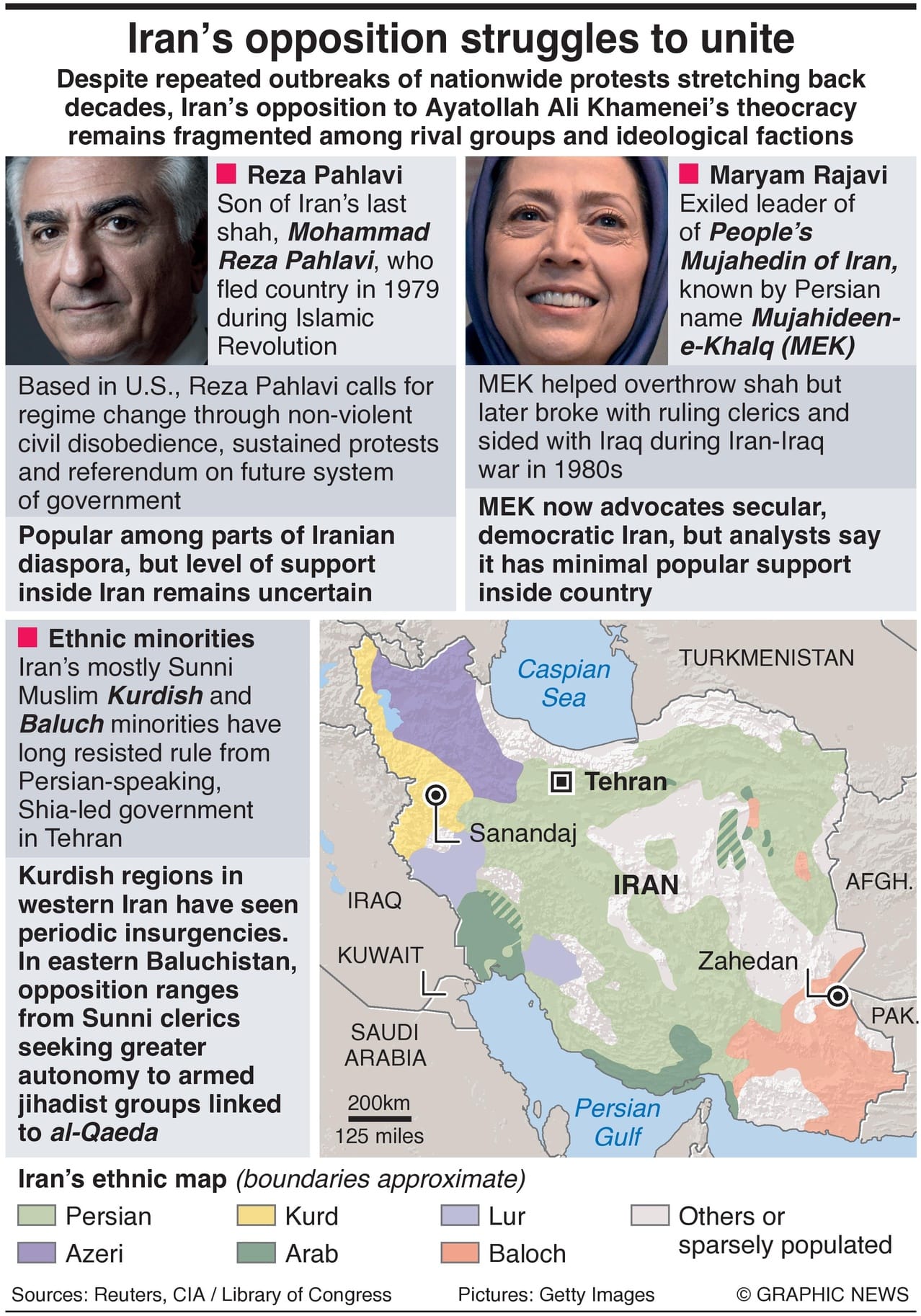 Despite repeated outbreaks of nationwide protests stretching back decades, Iran’s opposition to Ayatollah Ali Khamenei’s theocracy remains fragmented among rival groups and ideological factions.