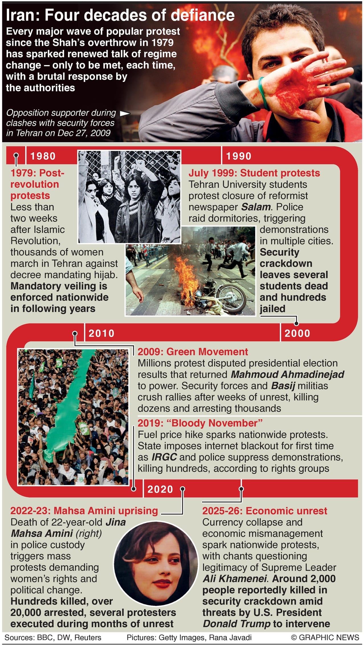 Most recently, in 2025 and 2026, a collapsing currency and deepening economic crisis triggered fresh nationwide protests, with demonstrators openly questioning the legitimacy of Supreme Leader Ali Khamenei. Reports suggest around 2,000 people were killed in the ensuing crackdown, amid heightened international tensions and threats by U.S. President Donald Trump to intervene.