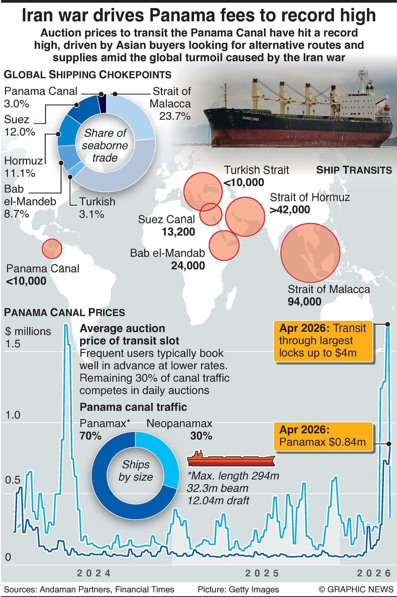 Auction prices to transit the Panama Canal have hit a record high driven by Asian buyers looking for alternative routes and supplies amid the global turmoil caused by the Iran war.