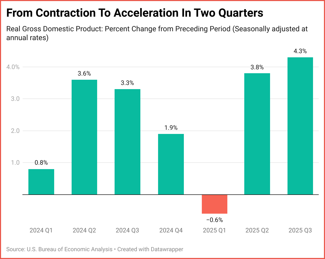 Today’s GDP report showed that real GDP grew at an annualized rate of 4.3% in Q3 2025 (July–September), accelerating from 3.8% in Q2 and marking the fastest pace in two years. The result significantly exceeded economists' expectations of roughly 3.2–3.3%, delivering a clear upside surprise.