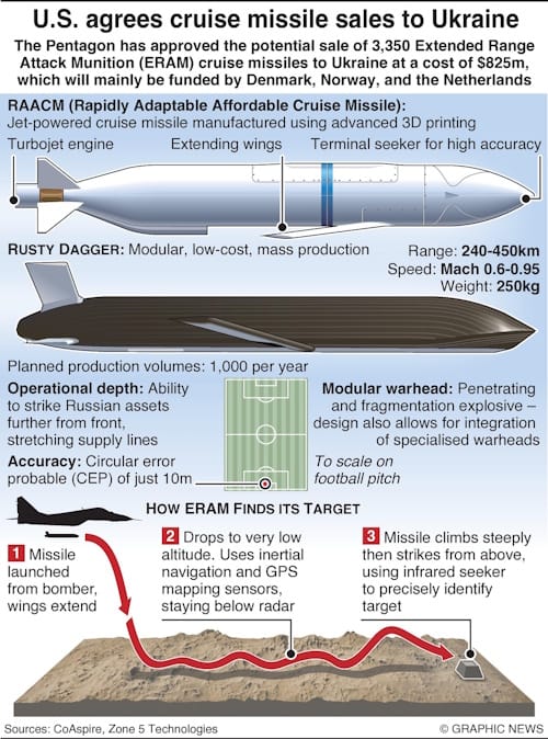 The Pentagon has approved the potential sale of 3,350 Extended Range Attack Munition (ERAM) cruise missiles to Ukraine at a cost of $825m, which will mainly be funded by Denmark, Norway, and the Netherlands.