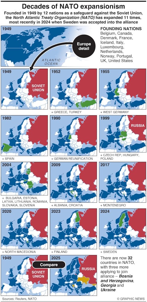 Founded in 1949 by 12 nations as a safeguard against the Soviet Union, the North Atlantic Treaty Organization (NATO) has expanded 11 times, most recently in 2024 when Sweden was accepted into the alliance.