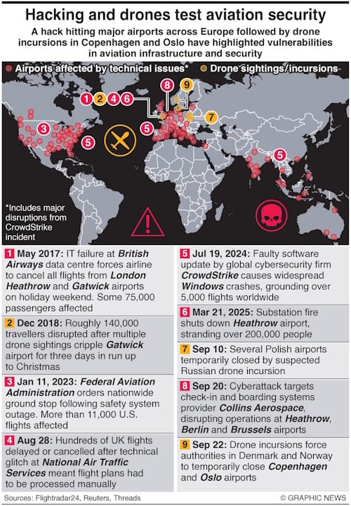 A hack hitting major airports across Europe, followed by drone incursions in Copenhagen and Oslo, has highlighted vulnerabilities in aviation infrastructure and security.