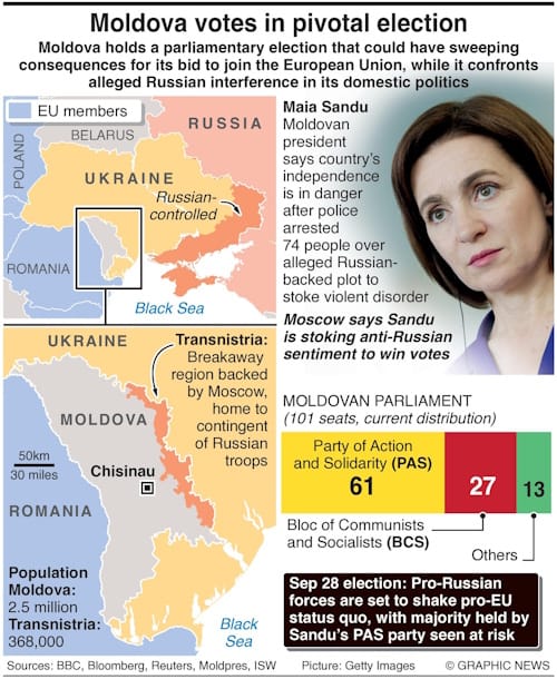 Moldova holds a parliamentary election that could have sweeping consequences for its bid to join the European Union, while it confronts alleged Russian interference in its domestic politics.