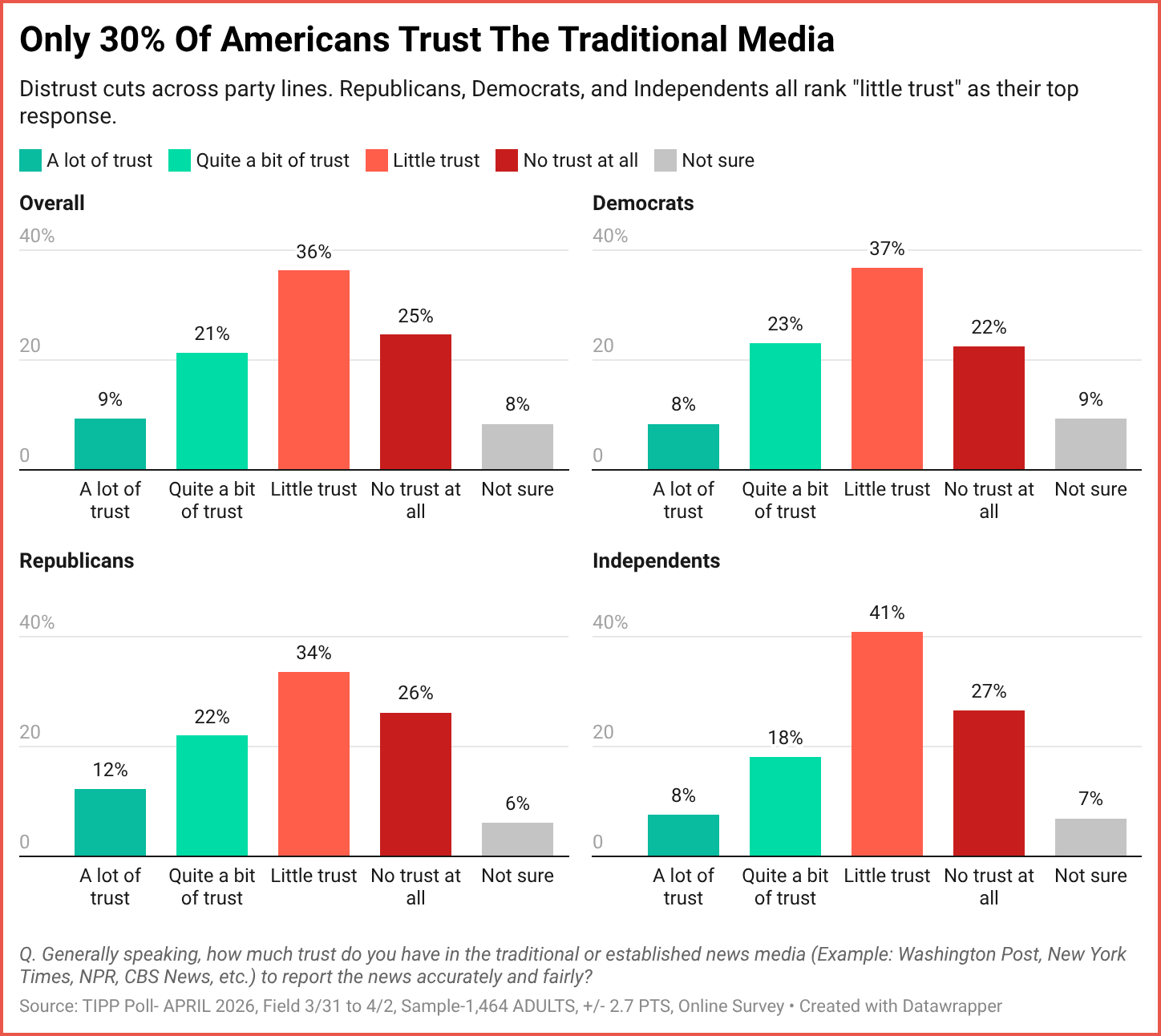In our latest national TIPP Poll, just 30% say they trust the traditional media to report the news accurately and fairly. A clear 61% say they do not. The rest aren’t sure.