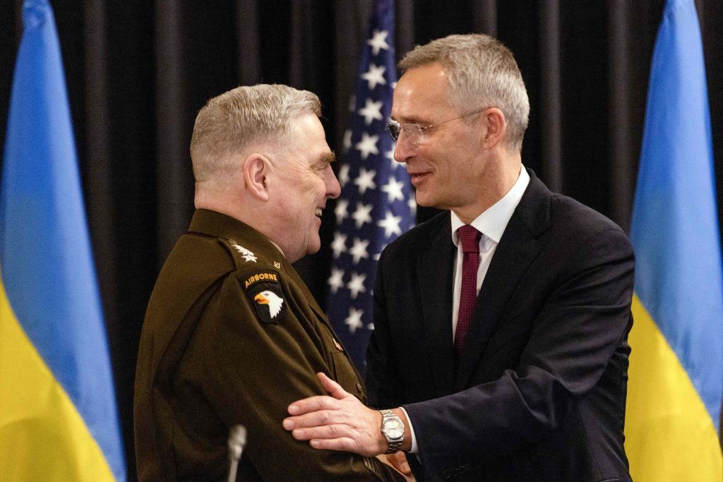 U.S. General Mark Milley (L) shakes hands with NATO Secretary General Jens Stoltenberg at their arrival to the Ukraine Defense Contact Group meeting at Ramstein Air Base in southwestern Germany on January 20, 2023. The United States convenes a meeting of around 50 countries -- including all 30 members of the NATO alliance -- at the US-run Ramstein military base in Germany to discuss military aid to Ukraine. Photo by ANDRE PAIN/AFP via Getty Images