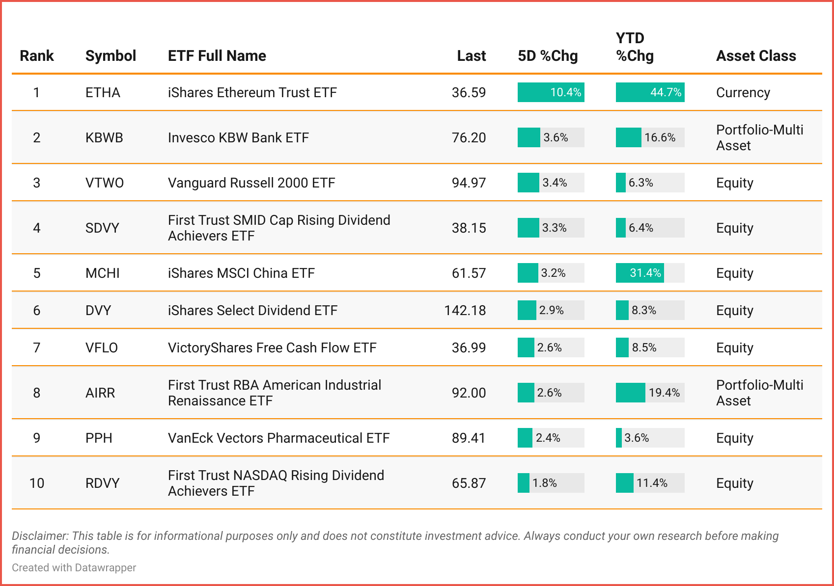 Tickers: ETHA | KBWB |VTWO |SDVY |MCHI |DVY |VFLO |AIRR |PPH | RDVY