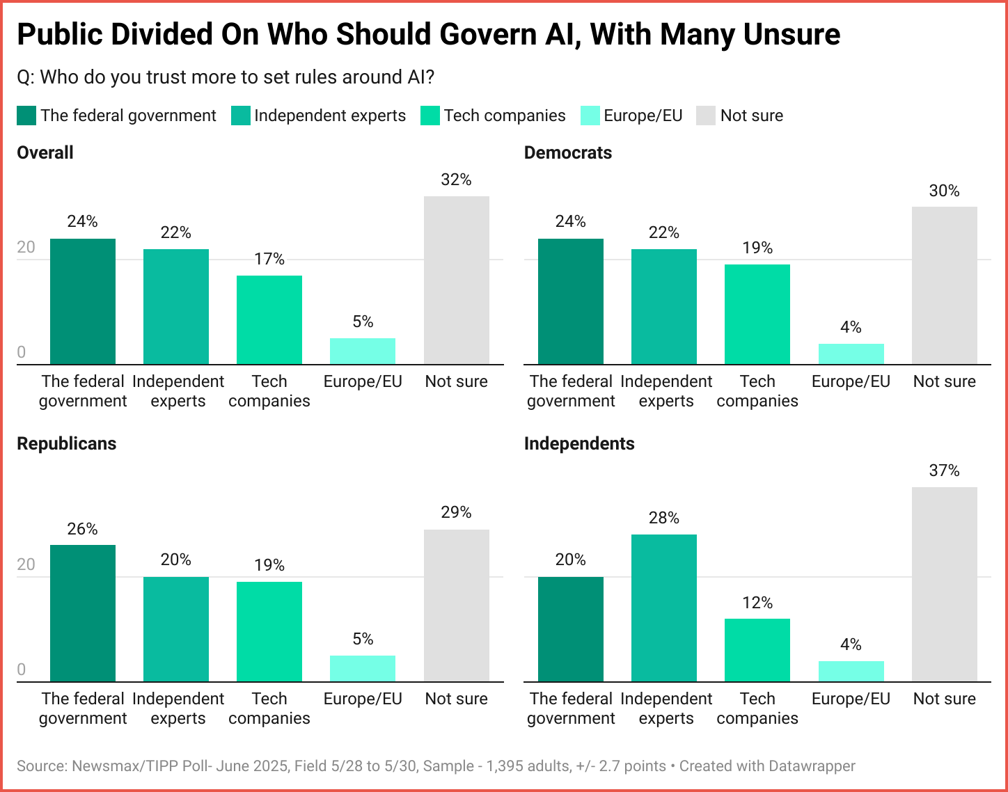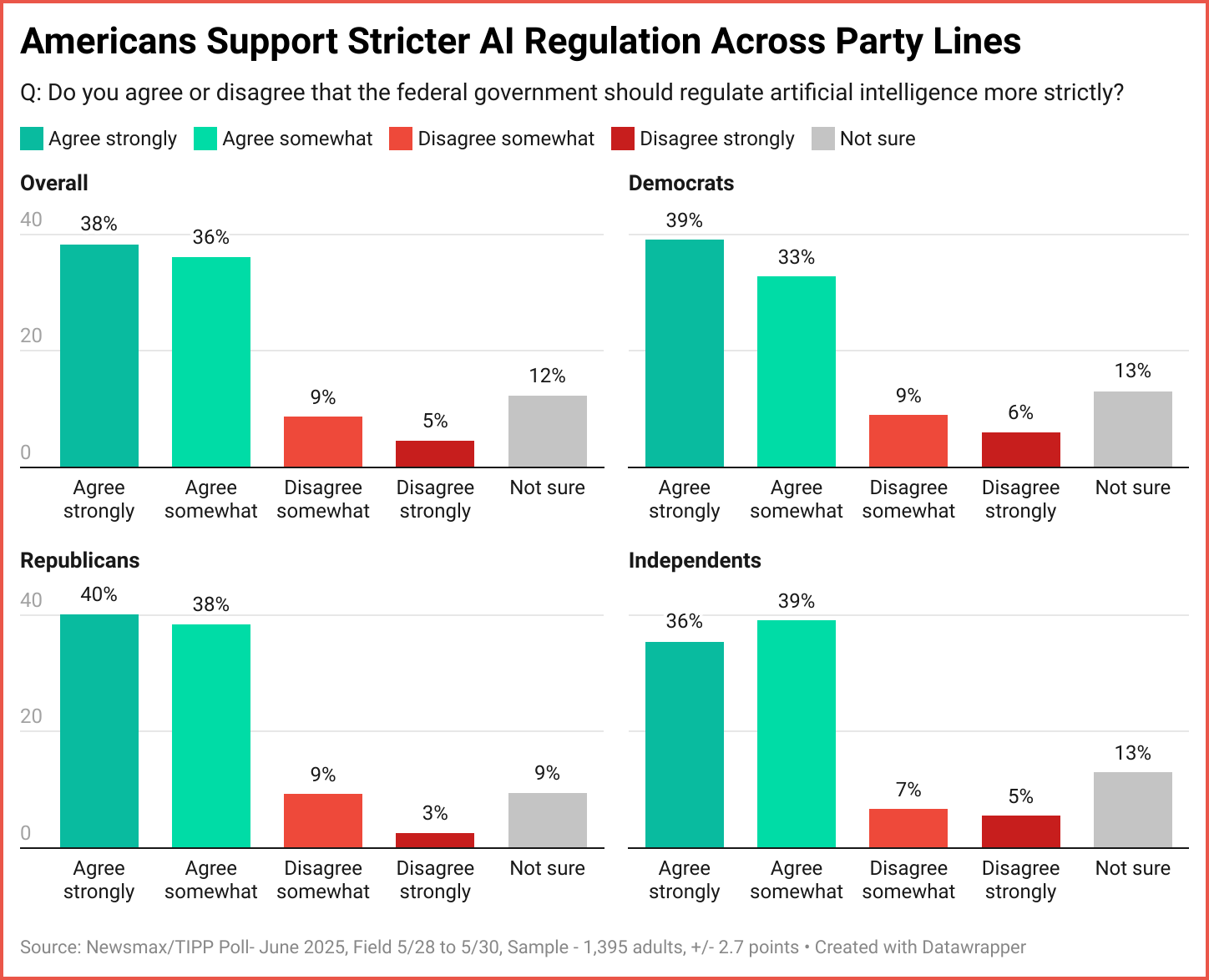 Three-quarters of those who participated in the Newsmax/TIPP Poll want the federal government to regulate Artificial Intelligence more strictly. A little more than a tenth (13%) disagree, while about an equal number are undecided. Regulating AI is an issue on which the deeply divided country is finding common ground—72% of Democrats, 78% of Republicans, and 75% of independents agree that the federal government should play a greater role in regulating AI.
