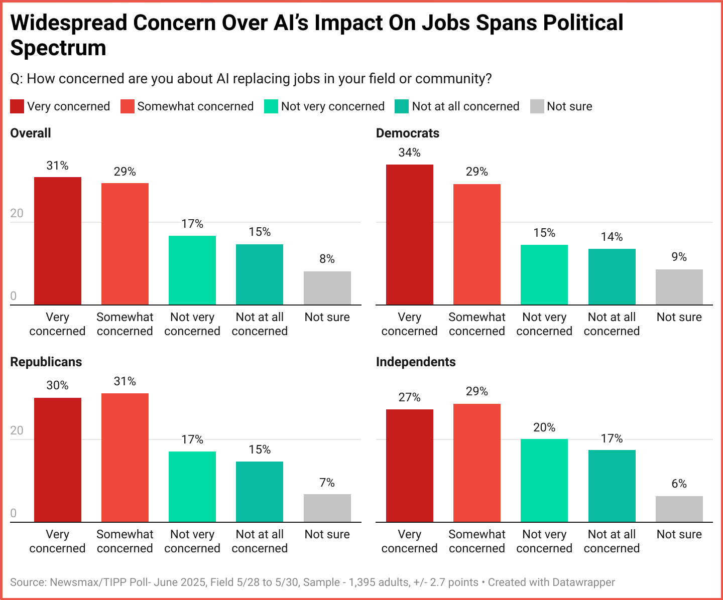 At present, Americans are most concerned about AI replacing jobs in their field or community. Concerns run deepest among those in the job market: two-thirds of 25–44-year-olds and nearly 6 in 10 of those just entering the workforce (18–24) fear AI could take away their jobs. Though political ideology has recently divided the country along partisan lines on all issues, the worry that AI will take away livelihoods is prevalent across parties.