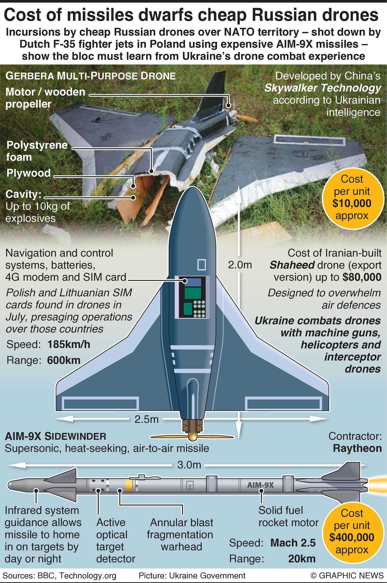 Incursions by cheap Russian drones over NATO territory – shot down by Dutch F-35 fighter jets in Poland using expensive AIM-9X missiles –show the bloc must learn from Ukraine’s drone combat experience.