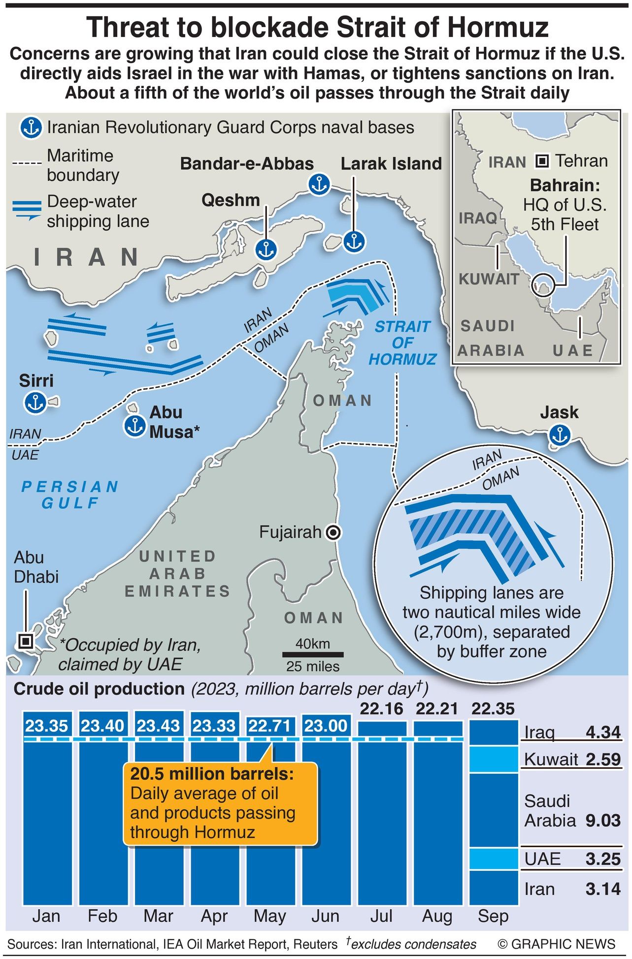 According to the International Energy Agency, an average of 20.5 million barrels of crude oil per day (bpd) passed through Hormuz between January-September 2023.