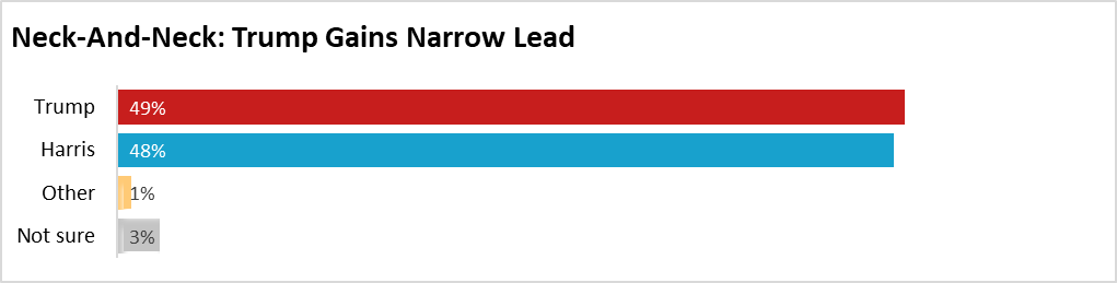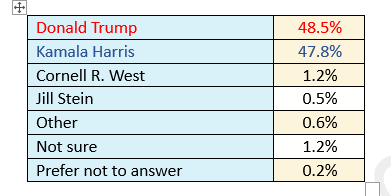 When third-party candidates are added to the mix, Trump leads Harris, 48.5% to 47.8%, third-party candidates barely register, with West at 1.2% and Stein at 0.5%, leaving 1.2% undecided.