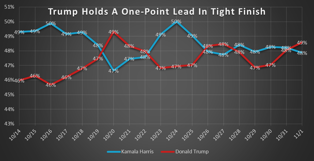 With just three days to go, Trump’s got a slim 49% to 48% lead over Harris as undecideds lock in their final choices. Pollster Mayur sees a steady glide into Election Day, with the numbers likely to hover between Harris +1 and Trump +2. The latest release of the tracking survey of 1,249 likely voters, conducted from October 29 to October 31, has a margin of ±2.7 points and shows a tight and steady race, each candidate setting up for a smooth, close landing. Distinct patterns by age, race, and region highlight a polarized electorate, and voter turnout among key demographics will determine the outcome. Recognized by The Washington Post in 2020 as the most accurate national presidential poll, TIPP continues to bring you the latest insights on the race.