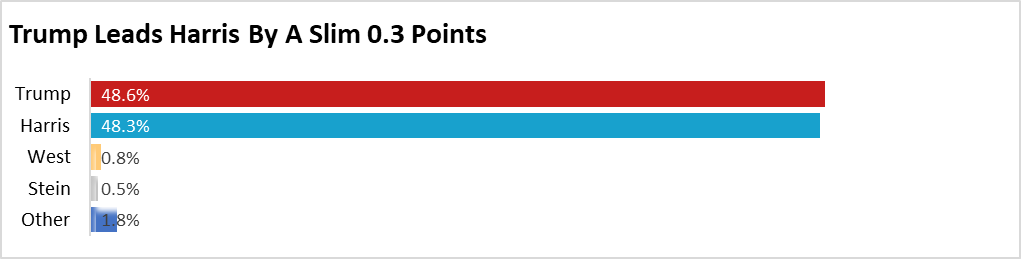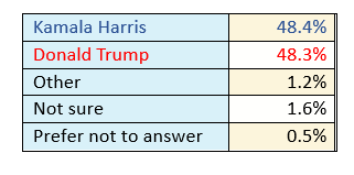 In a direct head-to-head matchup, Kamala Harris leads Donald Trump by a narrow 0.1-point margin, with 48.4% to Trump’s 48.3%. This razor-thin lead highlights the extraordinary closeness of the race. Additionally, 1.2% of respondents support other candidates, 1.6% remain undecided, and 0.5% prefer not to disclose their choice.