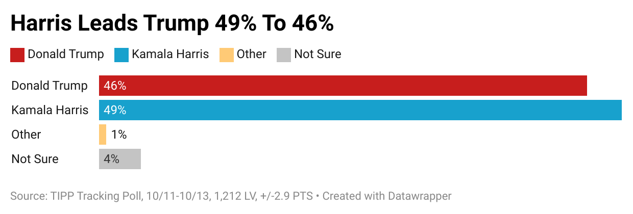 Vice President Kamala Harris holds a narrow lead over former President Donald Trump in the national popular vote, with 49% to 46%, according to the latest TIPP tracking poll of 1,212 likely voters conducted online from Friday, October 11 to Sunday, October 13. This is the first release of our 23-day tracking poll series. Recognized by The Washington Post in 2020 as the most accurate national presidential poll, TIPP continues to bring you the latest insights on the race. The survey has a margin of error of +/-2.9 points.