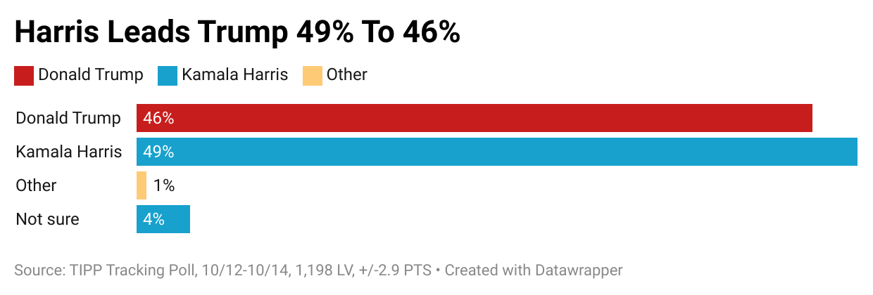 Vice President Kamala Harris holds a narrow lead over former President Donald Trump in the national popular vote, with 49% to 46%, according to the latest TIPP tracking poll of 1,198 likely voters conducted online from Saturday, October 12 to Monday, October 14. This is the second release of our 23-day tracking poll series. Recognized by The Washington Post in 2020 as the most accurate national presidential poll, TIPP continues to bring you the latest insights on the race. The survey has a margin of error of +/-2.9 points.