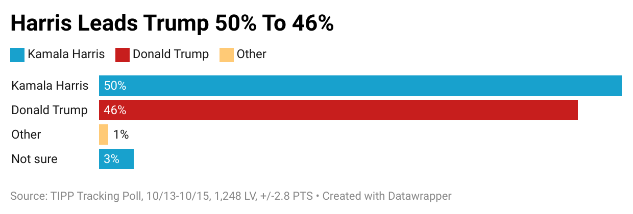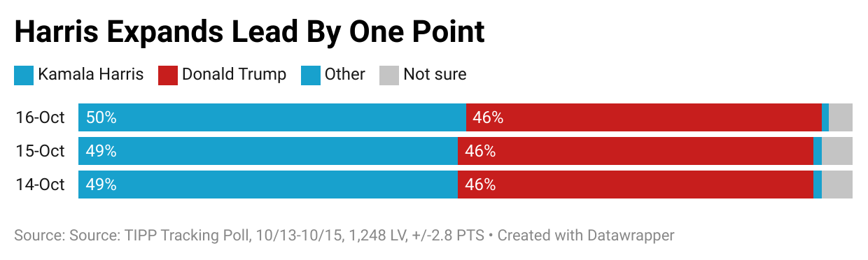 Vice President Kamala Harris’s lead over former President Donald Trump expanded slightly in the national popular vote. According to the latest TIPP tracking poll of 1,248 likely voters conducted online from Sunday, October 13, to Tuesday, October 15, Harris now leads Trump 50% to 46%. The survey has a margin of error of +/-2.8 points. This is the third release of our 23-day tracking poll series.This is the third release of our 23-day tracking poll series. Recognized by The Washington Post in 2020 as the most accurate national presidential poll, TIPP continues to bring you the latest insights on the race. The survey has a margin of error of +/-2.8 points.