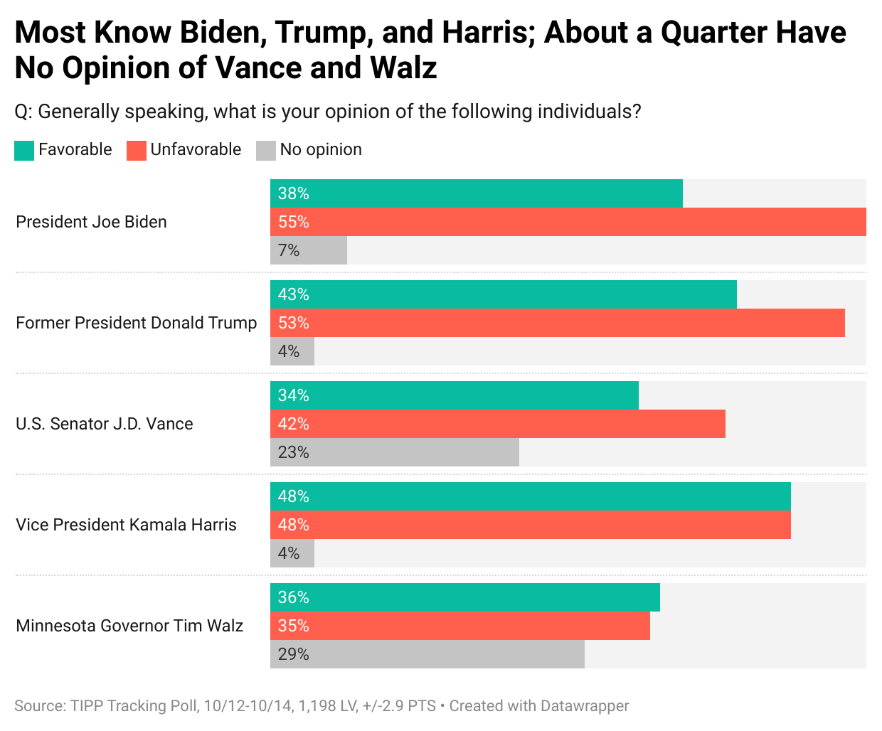 In contrast, many Americans are still undecided about U.S. Senator J.D. Vance and Minnesota Governor Tim Walz. About a quarter of people (23% for Vance and 29% for Walz) have no opinion. Vance holds a net favorability of -8, while Walz is just slightly positive at +1.