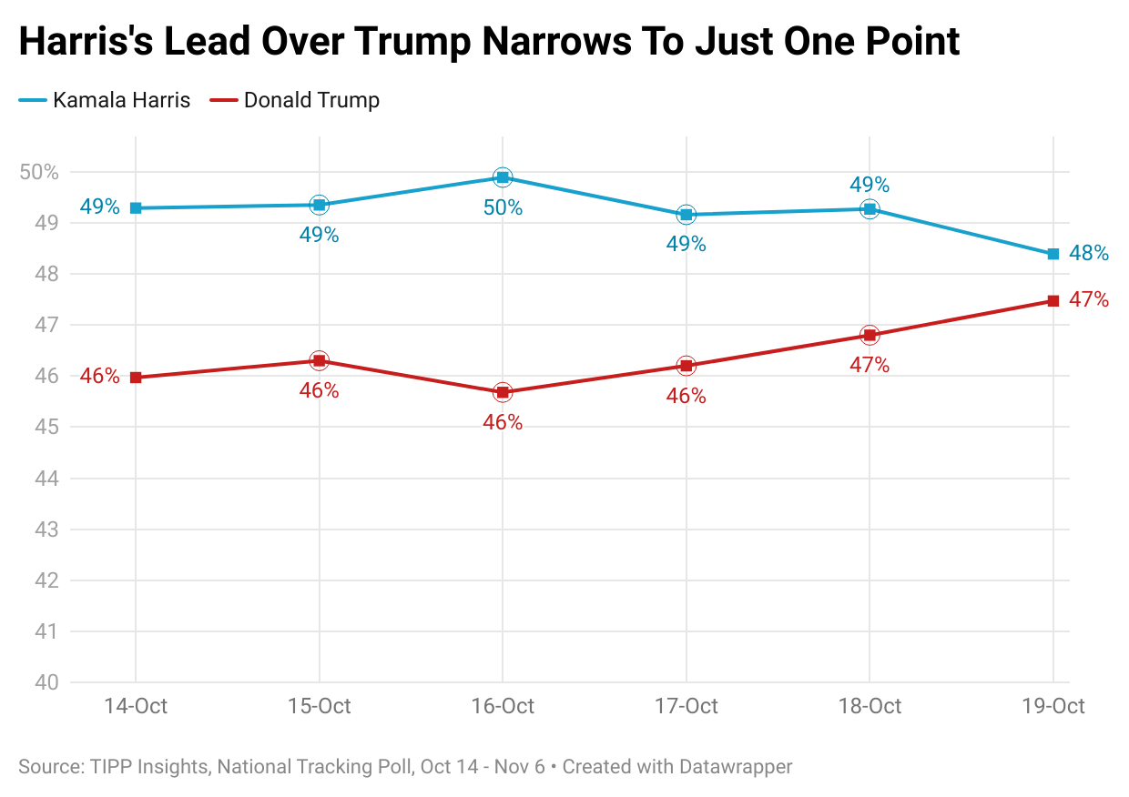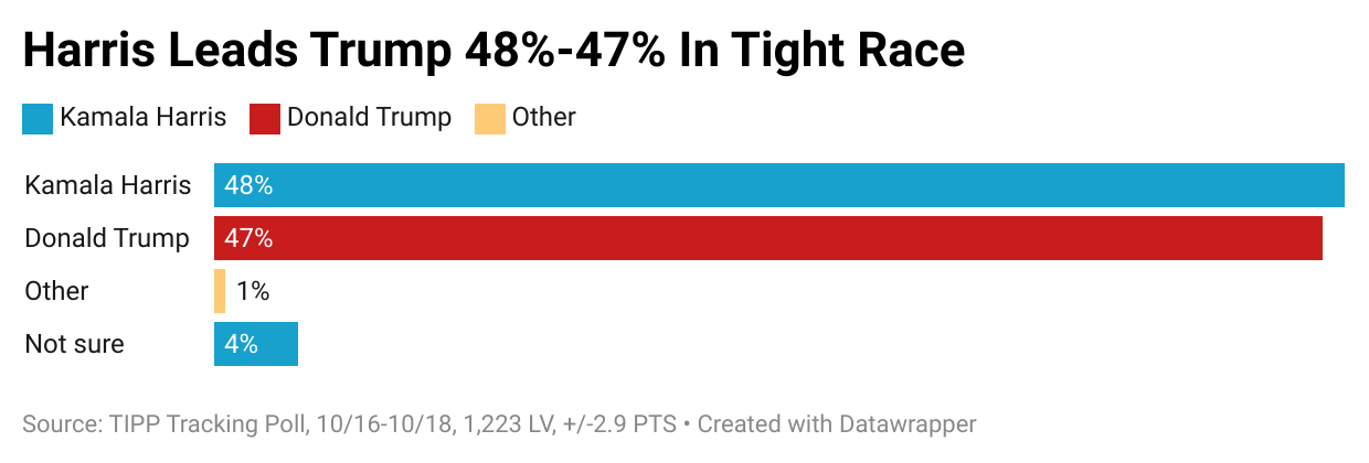 Vice President Kamala Harris's lead over Donald Trump has shrunk to just one point, with Harris at 48% and Trump close behind at 47%. This data from the sixth release of the 23-day TIPP tracking poll shows that the race is getting tighter. Recognized by The Washington Post in 2020 as the most accurate national presidential poll, TIPP continues to bring you the latest insights on the race.