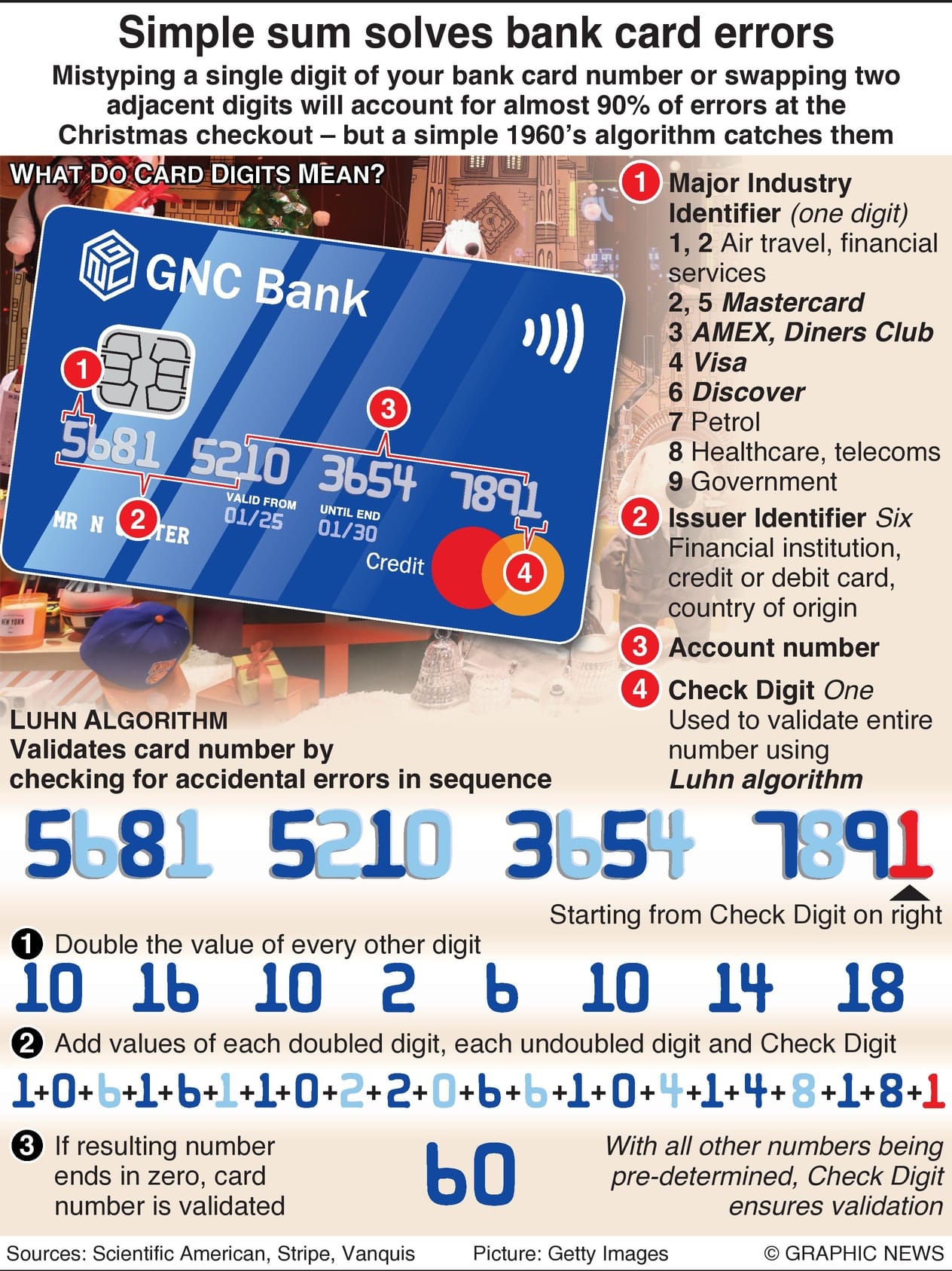 Mistyping a single digit of your card number or swapping two adjacent digits will account for almost 90% of errors at the Christmas checkout – but a simple 1960’s algorithm catches them.