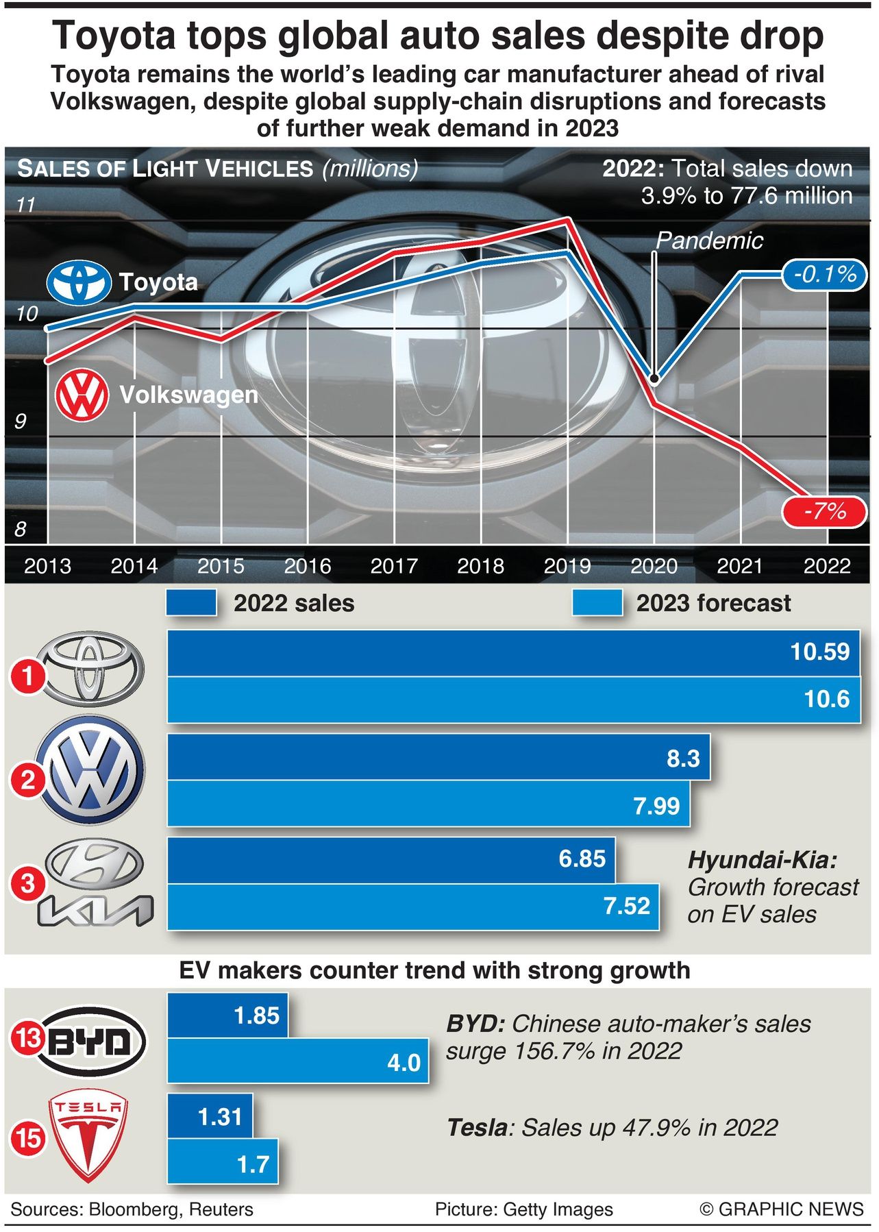 Toyota sold 10.5 million vehicles in 2022, and Volkswagen 8.3 million vehicles, with both companies hit by supply chain disruptions that have affected global automobile production following the pandemic and war in Ukraine.
