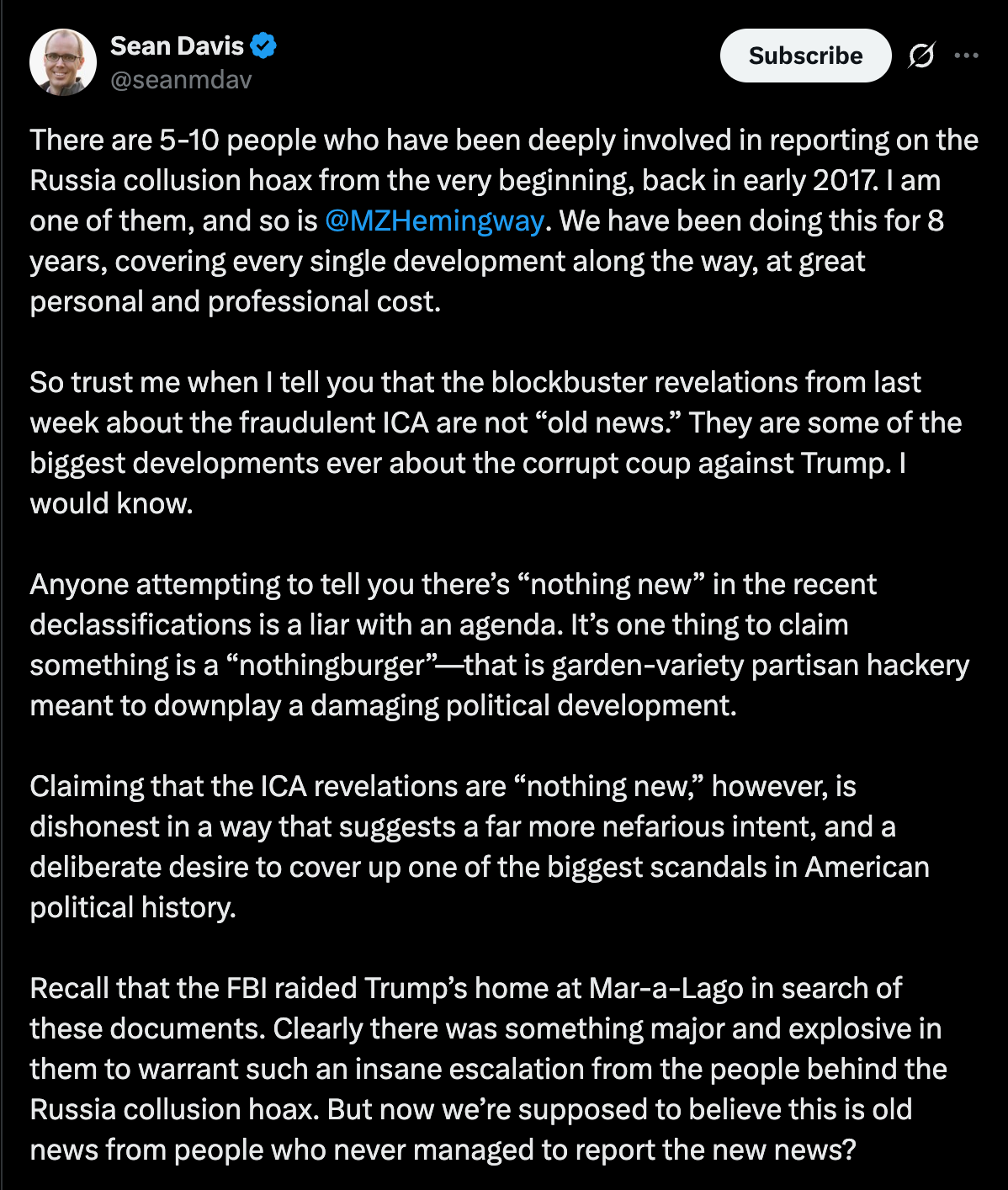 “There are 5–10 people who have been deeply involved in reporting on the Russia collusion hoax from the beginning,” Davis wrote on X, formerly Twitter. “I am one of them, and so is [Federalist editor] Mollie Hemingway.”