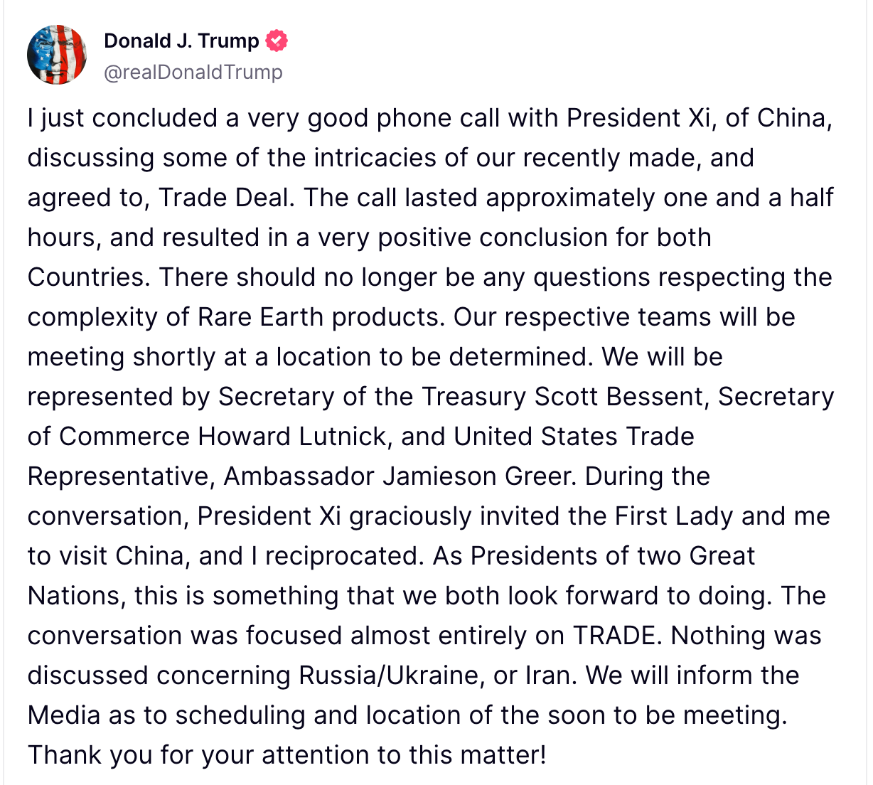 In a post on Truth Social, Trump said the 90-minute conversation led to a “very positive conclusion for both countries.”