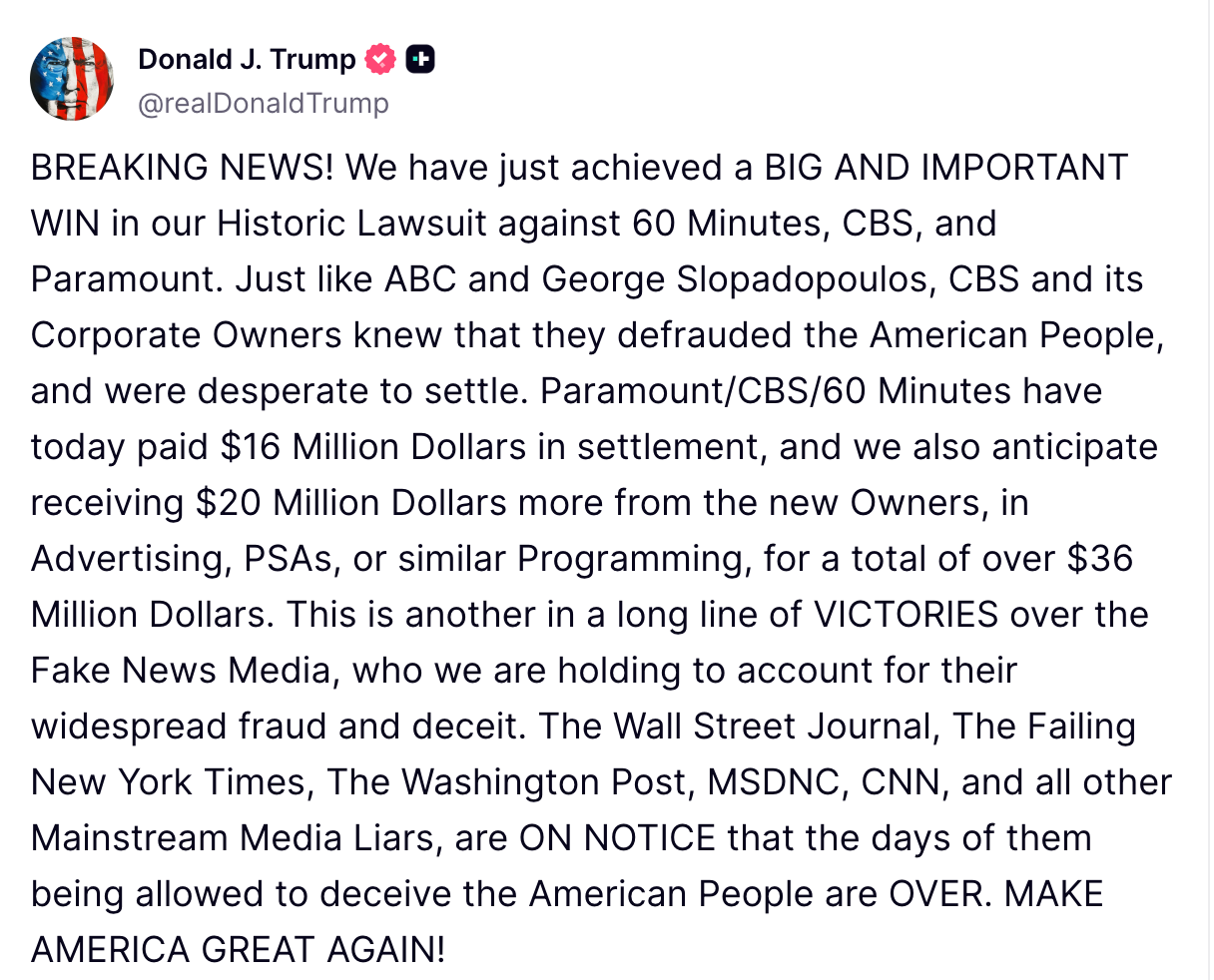 President Donald Trump announced Monday that CBS, Paramount, and 60 Minutes have agreed to a $16 million settlement in a lawsuit he filed over alleged media fraud — marking what he described as a “big and important win” in his ongoing battle against the mainstream press.