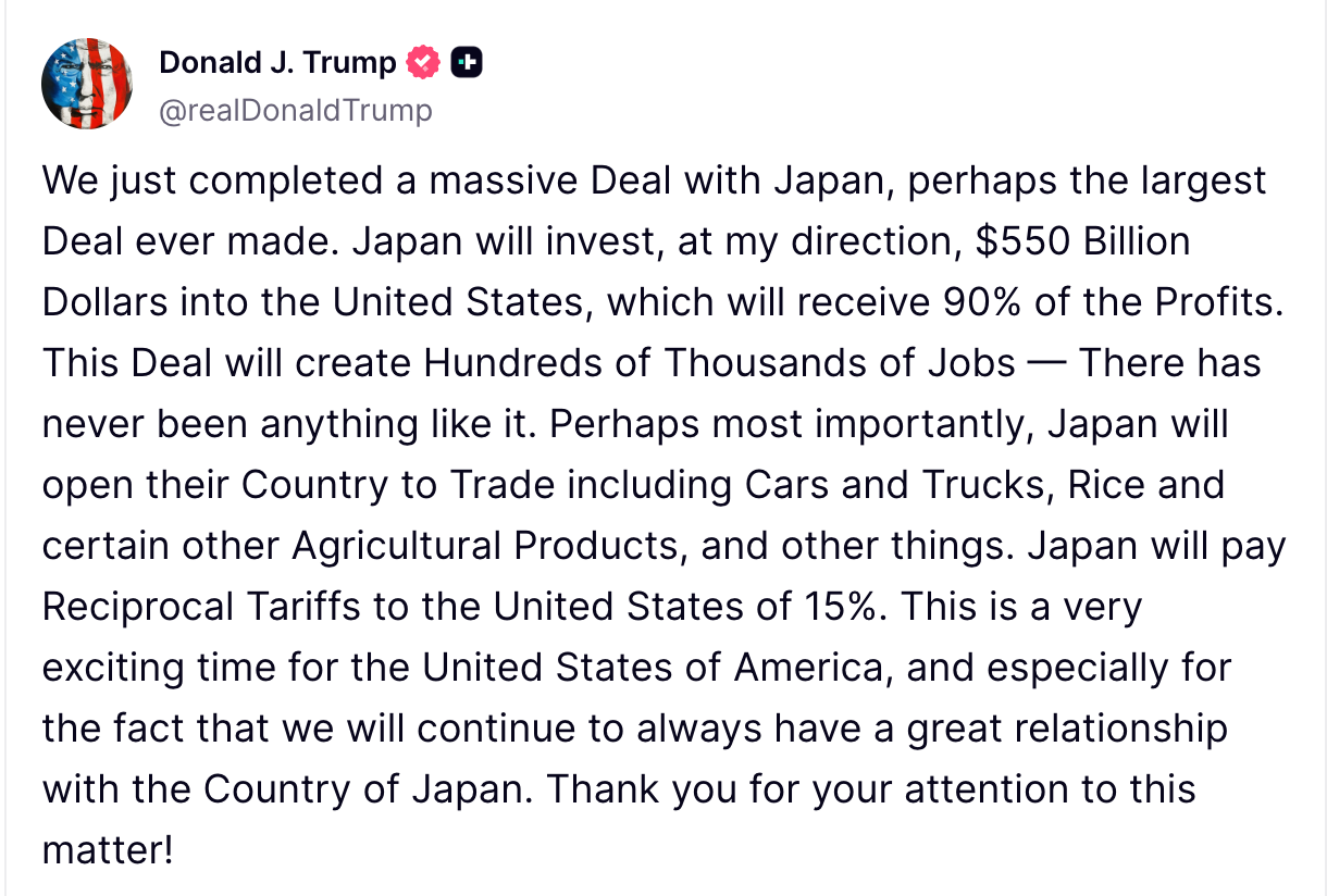 President Donald Trump on Tuesday unveiled a new trade framework with Japan, featuring a 15% tariff on imported Japanese goods and a headline-grabbing $550 billion investment pledge from Tokyo.
