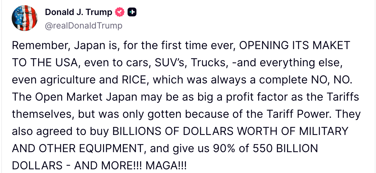 Calling it “a deal like no other,” Trump said Japan would invest the sum “at my direction” into U.S. industries while opening its markets to American-made cars and agricultural products, including rice. The president emphasized that the agreement would create “hundreds of thousands of jobs.”