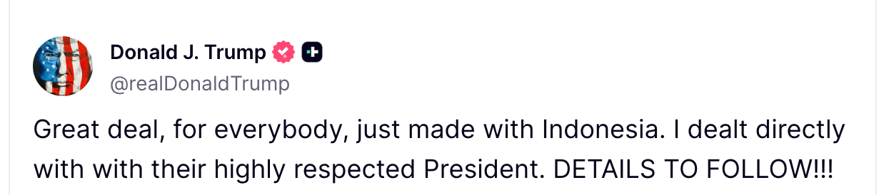 “Great deal, for everybody, just made with Indonesia. I dealt directly with their highly respected President,” Trump wrote on his platform, Truth Social.