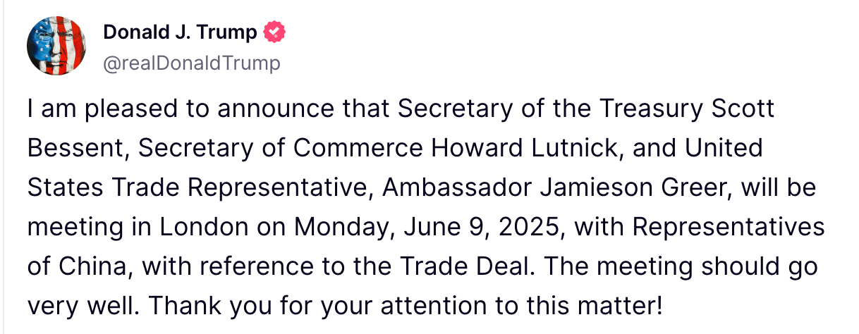 A high-level U.S. trade delegation will meet with Chinese officials in London on Monday, June 9, to discuss implementation of the recently finalized trade deal, President Donald Trump announced on Truth Social.