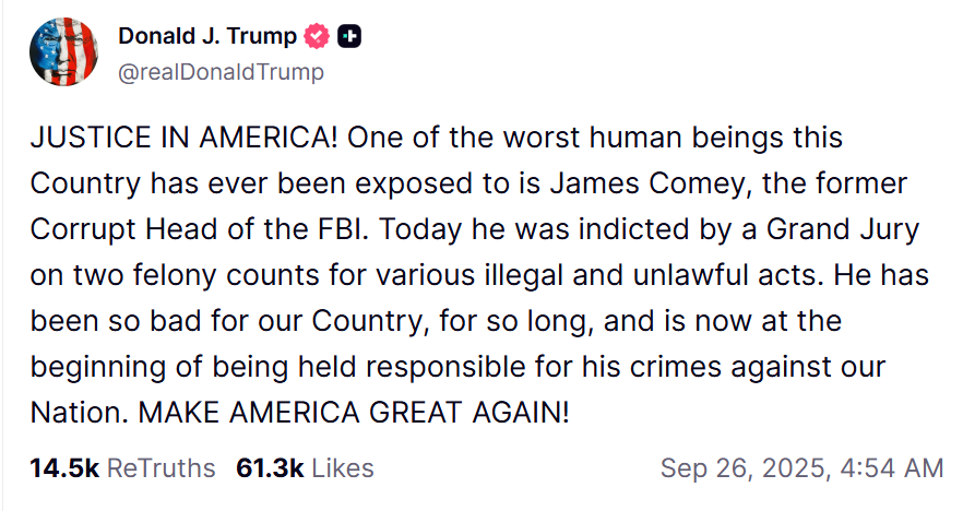 President Donald Trump hailed the indictment as “justice in America,” arguing that Comey epitomized corruption within the FBI. Attorney General Pam Bondi said the case shows “no one is above the law.”