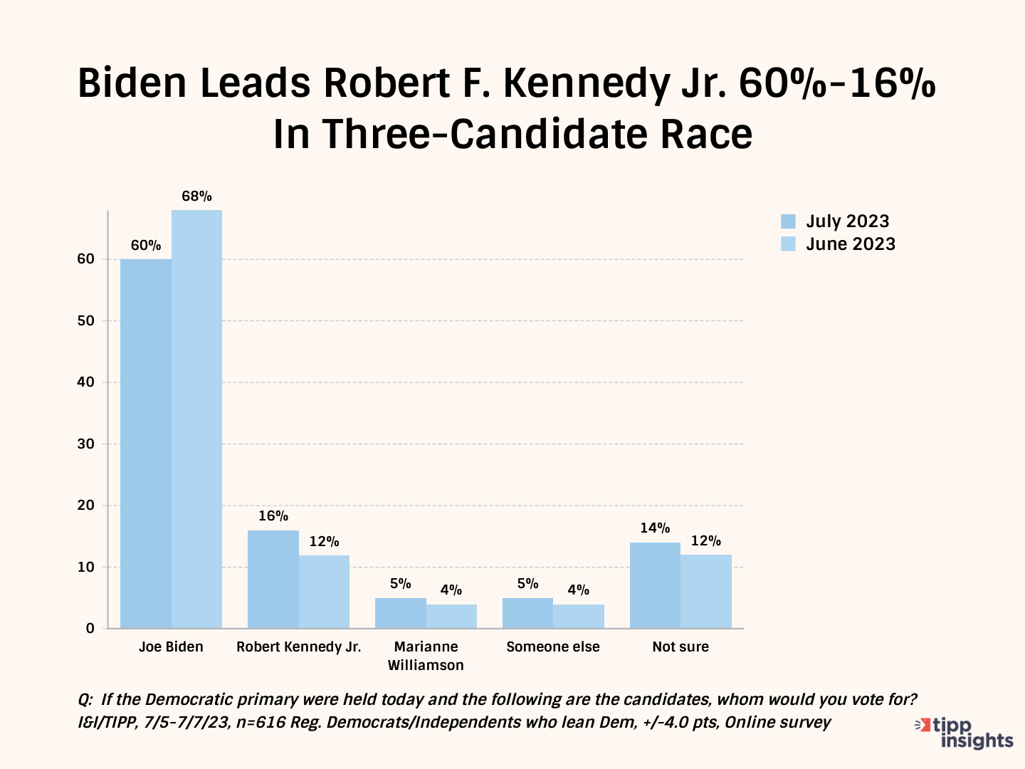 Against those two, Biden took 60% of the vote. But that was down from 68% in June. Kennedy got 16%, up from 12%, and Williamson took 5%, up from 4%.
