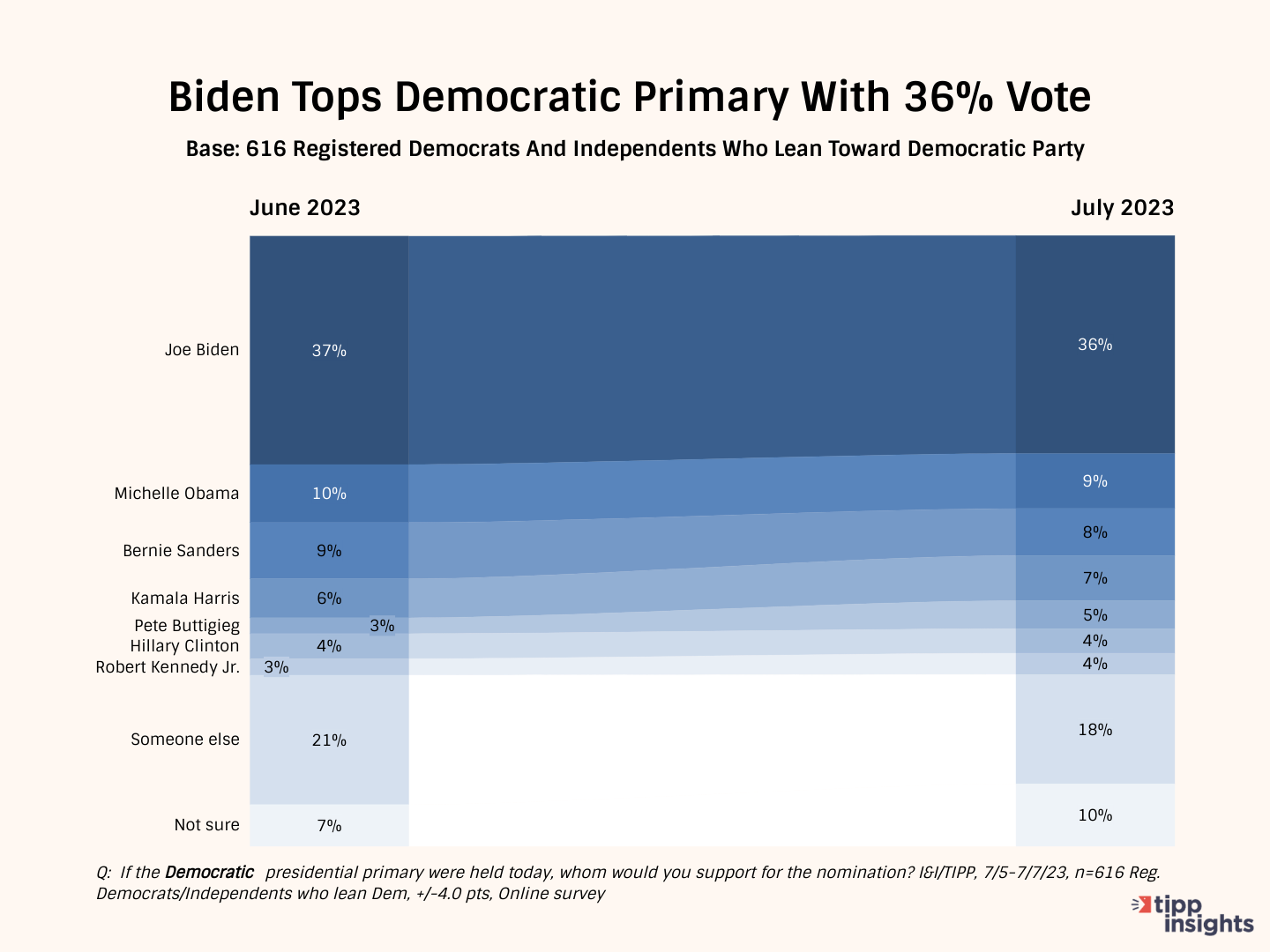 No doubt, not all of those we've polled against Biden will run next year. If so, that leaves an estimated 51% of the Democratic vote up for grabs by remaining potential challengers, or a Biden replacement. And even that 51% number doesn't include the 3% who responded that they'd pick "someone else" or the 10% who said they're "not sure".