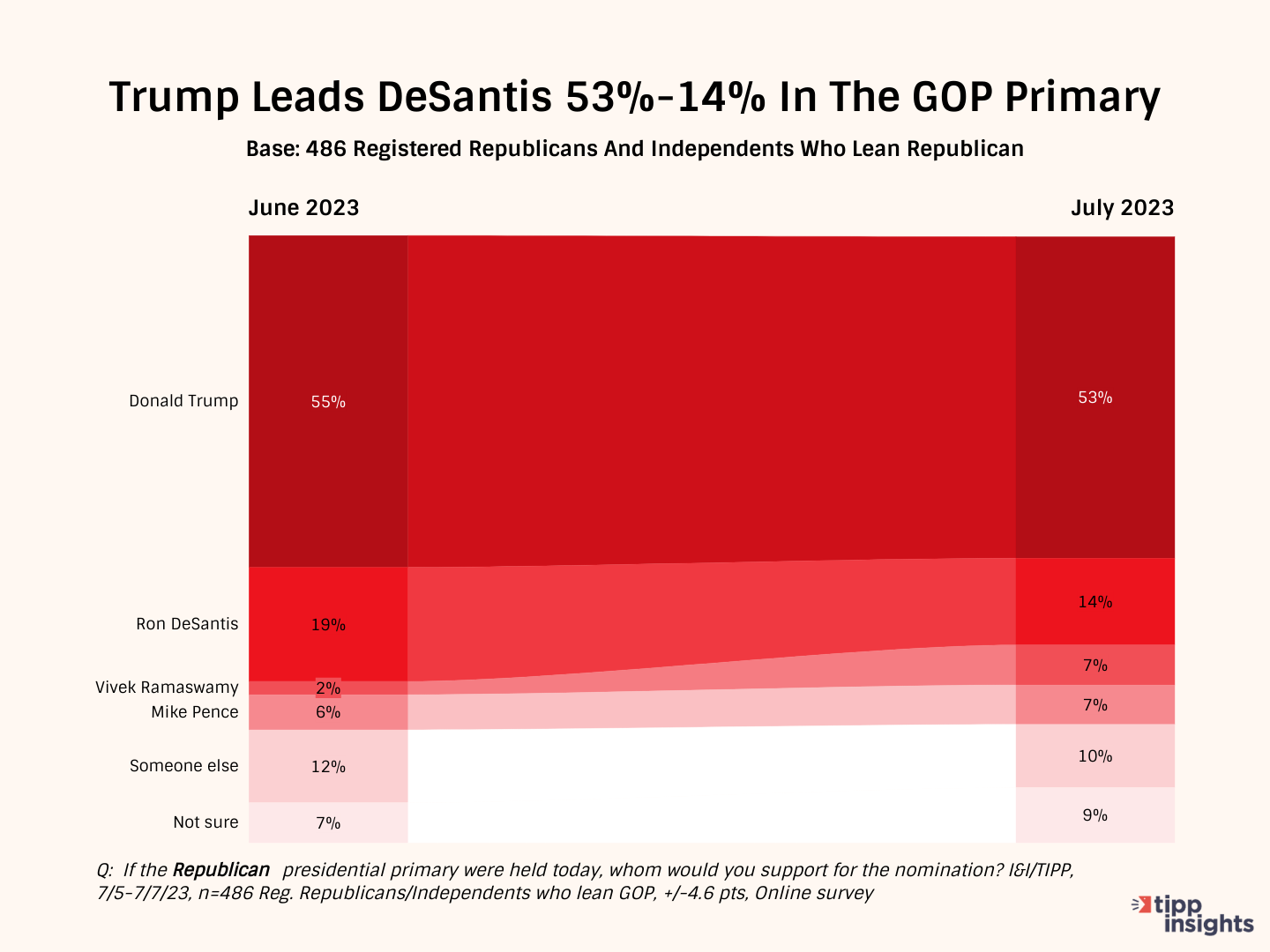 In the online I&I/TIPP Poll of 486 likely Republican primary voters and a +/-4.6 percentage point margin of error, Trump garnered 53% of GOP support. Coming in a distant second place was Florida Gov. Ron DeSantis at 14%, a 39-point gap. As recently as February of this year, DeSantis stood at 27% support, versus 50% for Trump, a 23-point gap.
