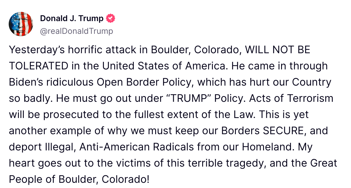 President Donald Trump condemned the Boulder, Colorado attack as an act of terrorism and demanded the deportation of the suspect, Mohamed Sabry Soliman, who allegedly overstayed a visa. In a post on Truth Social, Trump said the attack "will not be tolerated" and should be prosecuted "to the fullest extent of the law."